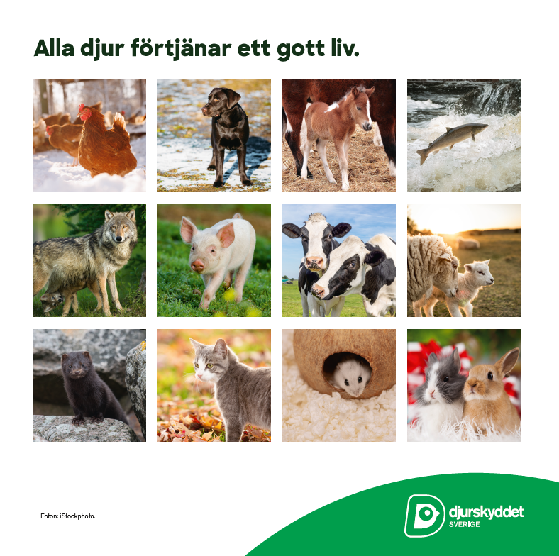 Djurskyddet Sveriges almanacka för 2026. Varje månad har en bild på ett nytt djur.