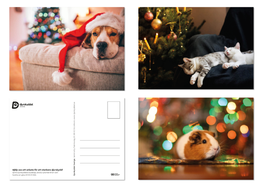 Tre olika sorters vykort på jultema. Hund, katter och marsvin. Vykorten beställs i set om sex stycken, två av varje. Bilden i nere i vänstra hörnet visar julkortets baksida.